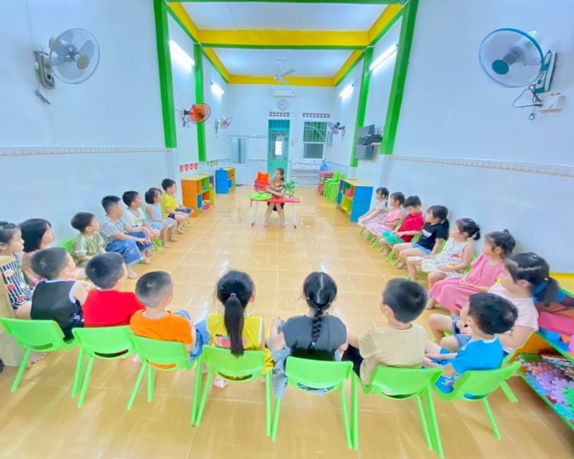 Trường có sân chơi thoáng mát, phòng học có đầy đủ thiết bị đồ dùng, đồ chơi, máy lạnh, tivi.